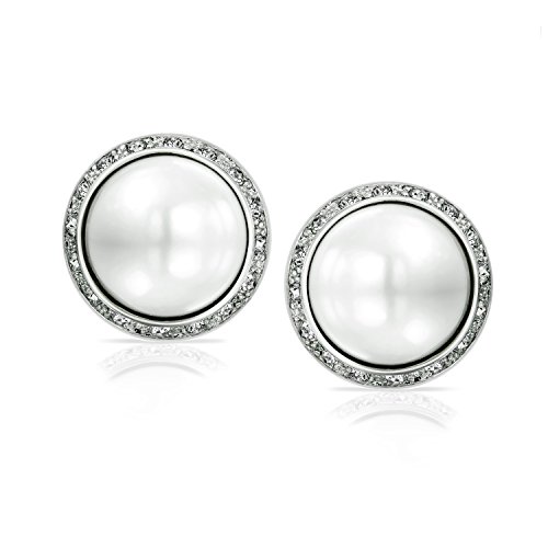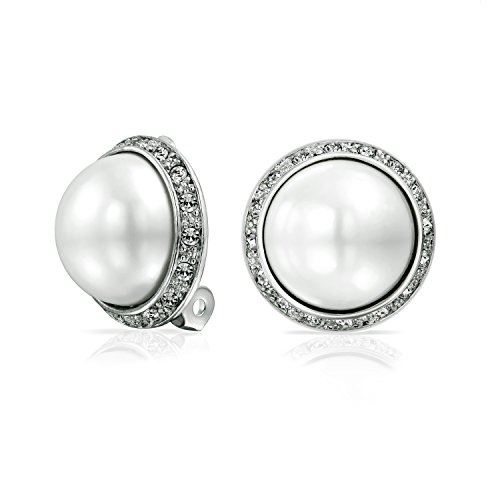These pave crystal pearl clip on earrings exude elegance. Featuring large white dome simulated pearls encircled by a pace crystal set silver toned disc. These amazing clip on pearl earrings will add a touch of sophistication to your jewelry box. Made with tarnish resistant material a consistent shine is guaranteed making these earrings the perfect gift for June babies or to wear on a formal occasion.