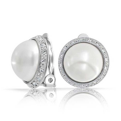 For an ideal June birthday gift or to add an extra bit of glamour to your everyday look, choose these sweet clip on earrings. A large, round, white, bezel set, simulated pearl glows within a frame of rhodium plated brass and crystal. For non - pierced ears.