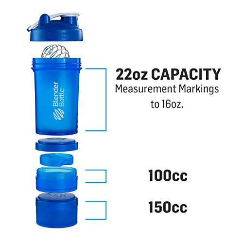 • Includes 22-ounce capacity BlenderBottle(Measurement markings to 16 oz), 150 cc jar, 100 cc jar, pill organizer and patented BlenderBall wire whisk
