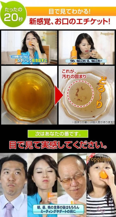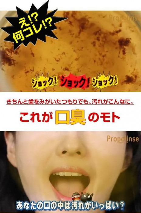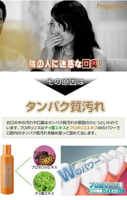 | きちんと歯をみがいたつもりでも、実は取れていない汚れが!?それが口臭のモトなんです!!プロポリンスならたったの20秒うがいをするだけでニオイの元となるタンパク質汚れを吸着して排出します。汚れが目で見えるから爽快感も格別!!アルコールフリーなのでお子様からお年寄りの方まで幅広くお使いいただけます♪ |