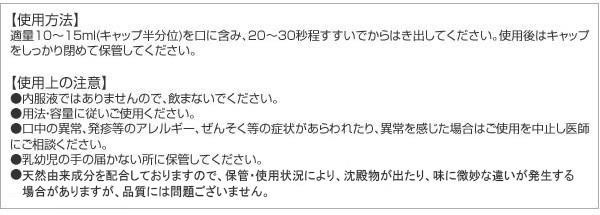 | 成分 | 水、グリセリン(湿潤剤)、PEG-60水添ヒマシ油(可溶化剤)、プロポリスエキス・チャ葉エキス・キシリトール・メントール・サッカリンNa(香味剤)、クエン酸、クエン酸Na・リンゴ酸(pH調整剤)、カラメル(着色剤)、安息香酸Na(保存剤)、香料 |
