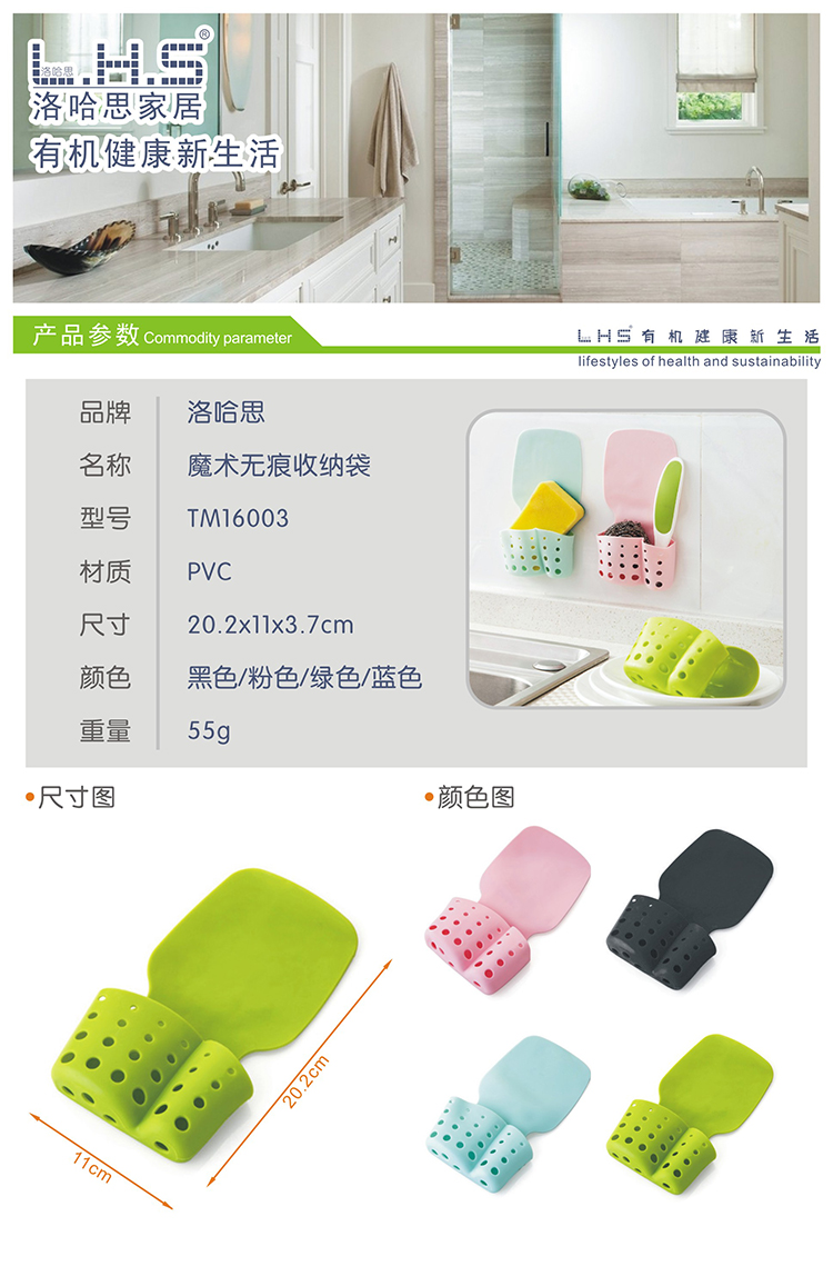 清新色彩,无痕粘胶设计,沾水就可吸附在光滑的墙面上,浴室,水槽,玻璃茶几都可以贴,带有沥水袋,放在厨房可放海绵,刷子等厨房小工具,沥干水份很方便。