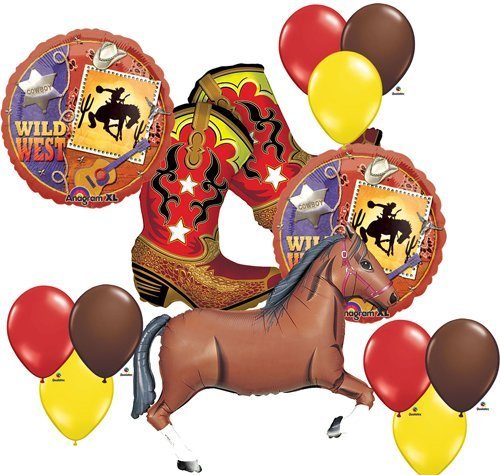 -. Feature : Wild West Cowboy Boots Horse Party Supplies Balloons Decor / (1) 36" Cowboy Boots Foil Balloon / (1) 43" Brown Horse Foil Balloon / (2) 18" Wild Wild West Round Foil Balloons / (9) 11" Matching latex balloons