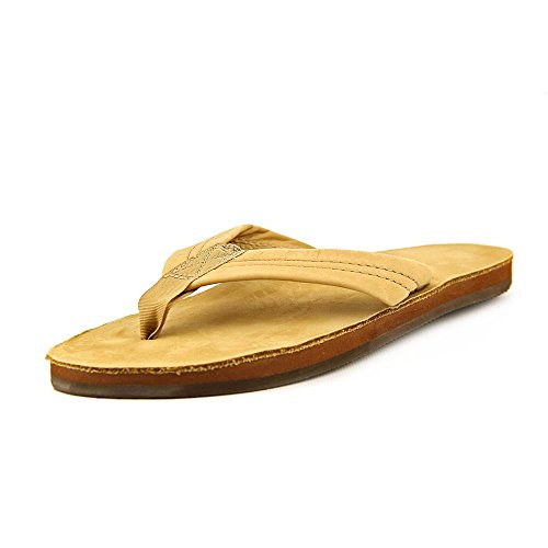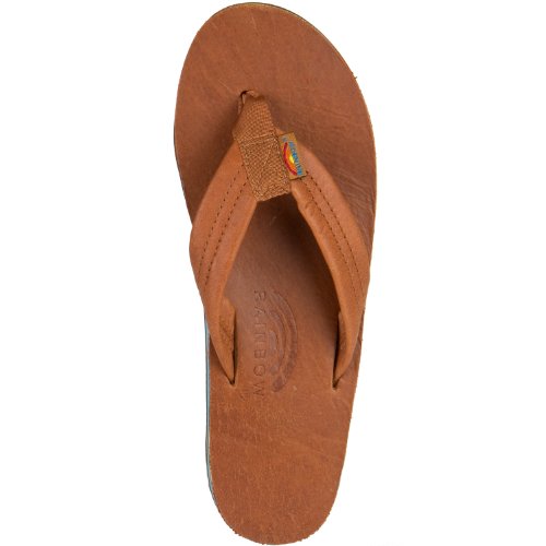 The top sole is classic finished leather, and is embossed with the Rainbow logo. The classic leather strap is double stitched, and the nylon toe piece is secured with a box X stitch, all sewn with bonded nylon thread.