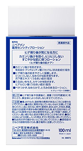 -. Binding : Health and Beauty -. Brand : KAO -. EAN : 4901301226686 -. Feature : Sensitive Post Shave Lotion immediately helps to calm and soothe skin and alleviate skin dryness after shaving / Size:100ml / Bottle / Made in Japan / No alcohol, no fragrance, no coloration -. Label : Kao -. LegalDisclaimer : Actual product packaging and materials may contain more and different information than what is shown on our website. We recommend that you do not rely solely on the information presented and that you always read labels, warnings, and directions before using or consuming a product. -. Manufacturer : Kao -. MPN : 4901301226686 -. PackageQuantity : 1 -. PartNumber : 4901301226686 -. ProductGroup : Beauty -. ProductTypeName : HEALTH_PERSONAL_CARE -. Publisher : Kao -. Studio : Kao -. Title : NIVEA for Men Sensitive Facial Lotion 100ml