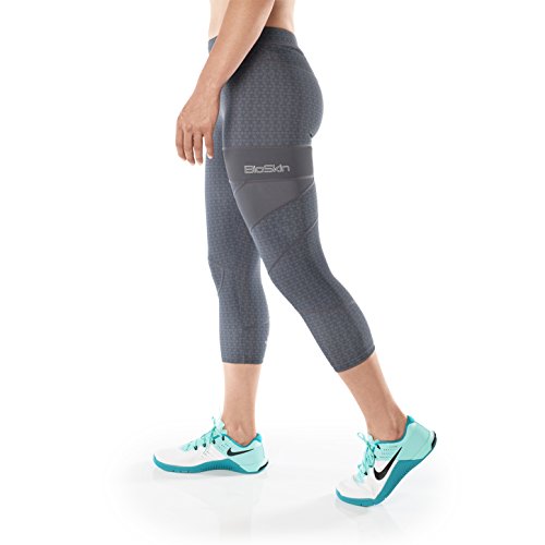 -. Binding : Apparel -. Brand : BioSkin -. Color : Charcoal Hex -. Department : womens -. Feature : ZIPPERED POCKET: Over-sized back pocket fits iPhone 6 / COMFORTABLE COMPRESSION: 20% Lycra gives compression and secure fit / REFLECTIVE DETAIL: Zippers at ankles with reflective detail / STAYS IN PLACE: Compressive fabric hugs you just right so you won't need to keep readjusting your tights. Also comes with a removable adjustable drawing / DURABLE: Fabric stays looking brand new because it won't pill or collect lint. -. PackageQuantity : 1 -. ProductGroup : Apparel -. ProductTypeName : PANTS -. Title : Perfect Fit Running Compression CaP.R.Is, 3/4 Leggings with Phone Pocket - Gray
