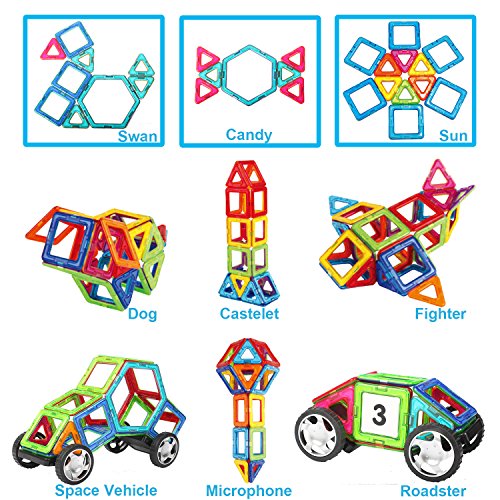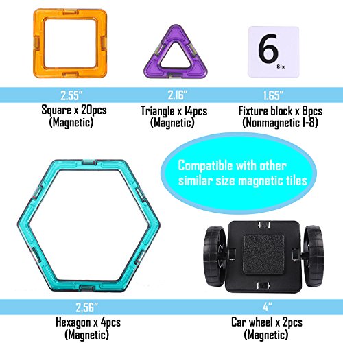 【Best choice for beginner】: Totally 46pcs: including 14*triangle, 20*quadrangle, 4*hexagon, 6*fixture block, 2*car wheel, 1*storage bag and 1*booklet. 2 different random colors on each side of each magnetic tile. Can upgrade by buying more blocks.