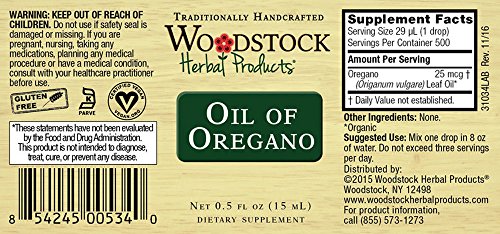 -. Binding : Health and Beauty -. Brand : Woodstock Herbal -. EAN : 0854245005340 -. Feature : Oil of Oregano - .5 fl oz. - 500 servings per bottle / Woodstock Herbal Products / Traditional Handcrafted Formula / Take one drop, 3 times a day in an 8 oz. glass of water or juice / 500 servings -. IsAdultProduct : 0 -. Label : Woodstock Herbal Products -. LegalDisclaimer : Do not exceed 3 - 1 drop servings per day. -. Manufacturer : Woodstock Herbal Products -. MPN : 3104 -. PackageQuantity : 1 -. PartNumber : 3104 -. ProductGroup : Health and Beauty -. ProductTypeName : HEALTH_PERSONAL_CARE -. Publisher : Woodstock Herbal Products -. Studio : Woodstock Herbal Products -. Title : Oil of Oregano ~ .5 ounce bottle contains 500 Servings! Super Strong ~ Cost Effective -. UPC : 854245005340