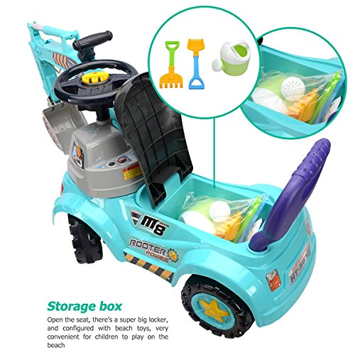 -. Feature : 3-in-1 Ride-On Toy: Digger, Scooter & Pulling cart / Rotation driver's cab, Raise or depress the handle to make the arm up or down / Music steering wheel with switch, Lights flash with music / Help to build baby's physical skills and learn movement / Around 20 minutes to assemble