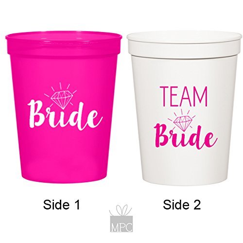 - 1 Bride hot pink cup (white imprint) and 9 Team Bride white cups (hot pink imprint), 2 side imprint