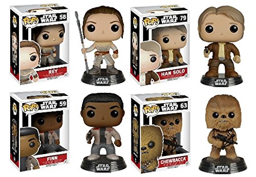 -. Binding : Toy -. Brand : Funko POP! -. EAN : 0662248826516 -. Feature : The Force Awakens! / Check out the other Star Wars Episode 7 figures from Funko! / Collect them all! -. IsAdultProduct : 0 -. Label : Funko -. Manufacturer : Funko -. PackageQuantity : 4 -. ProductGroup : Toy -. ProductTypeName : TOYS_AND_GAMES -. Publisher : Funko -. Studio : Funko -. Title : Funko POP! Star Wars: Episode VII - Rey & Finn w/ Han Solo & Chewbacca Vinyl Bobble-Heads NEW -. UPC : 662248826516