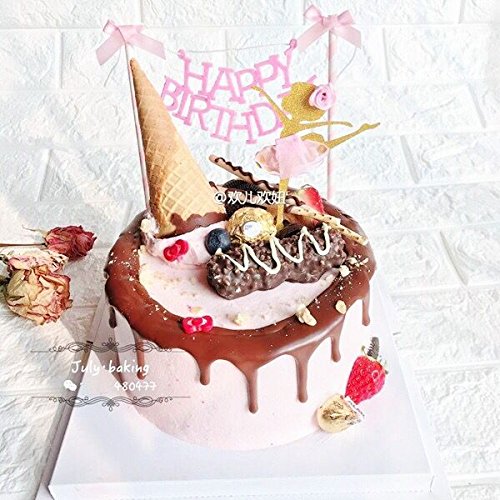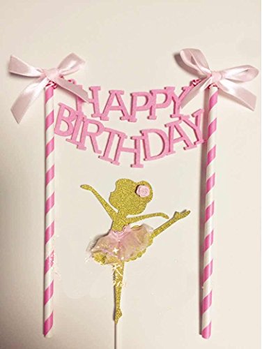 Astra Gourmet HAPPY BIRTHDAY Cake Bunting Topper with Pink Bows and Straws, Gold Glitter Ballerina Cake Topper with Pink Dress, Set of 2 Birthday Party Decorations