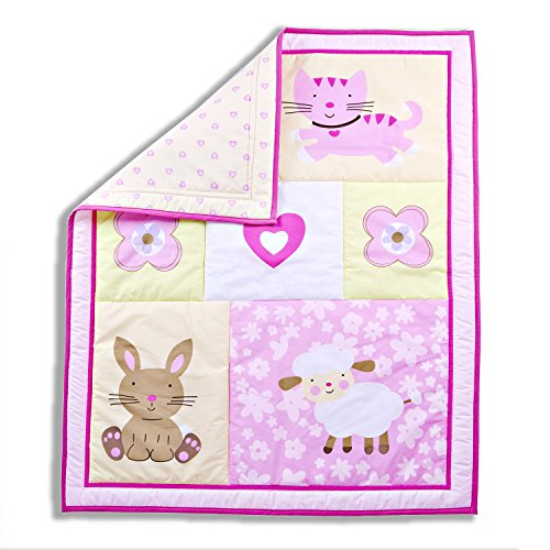 -. Feature : Set Includes: Bumper, Comforter, Fitted Sheet, Crib Skirt and Diaper Stacker / Fabric Content: Poly Cotton / Care: machine wash bedding set separately in cold water, gentle cycle; use only non-chlorine bleach when needed; tumble dry low heat; iron on low heat when needed / Fits a Standard Size Crib Mattress with Dimensions of 28" x 52" / Comforter Measures: 33" x 42" / 3-piece crib bedding set includes a comforter, bumper and fitted sheet / 35 percent cotton and 65 percent polyester fabrics; comforter and bumper has 100 percent polyester fiber fill; Sheets fit a standard 38" X 24" crib mattress; Comforter measures 38 X 24 inches; / Care: machine wash 3-piece crib bedding set separately in cold water, gentle cycle; use only non-chlorine bleach when needed; tumble dry low heat; iron on low heat when needed