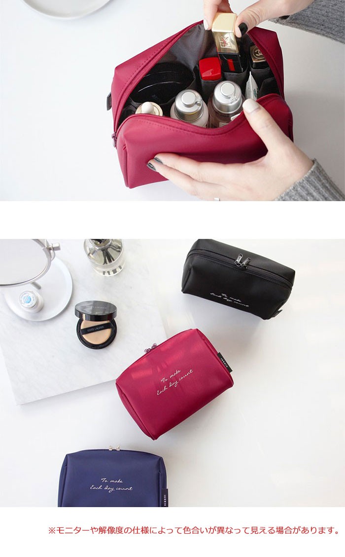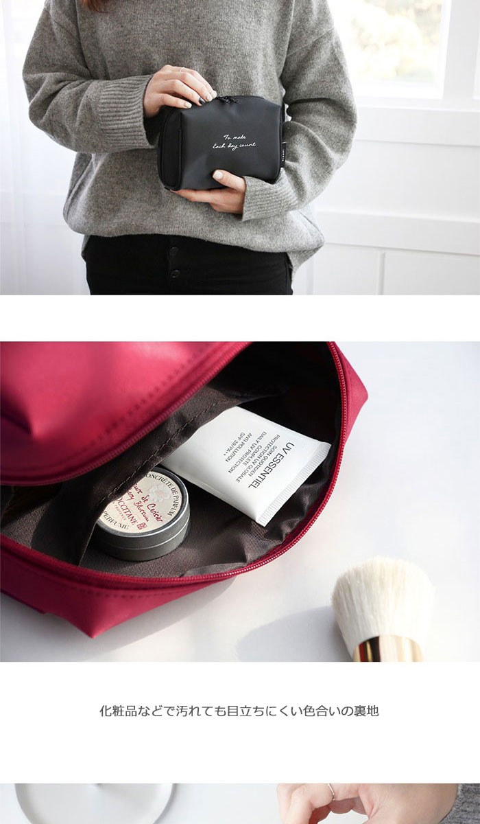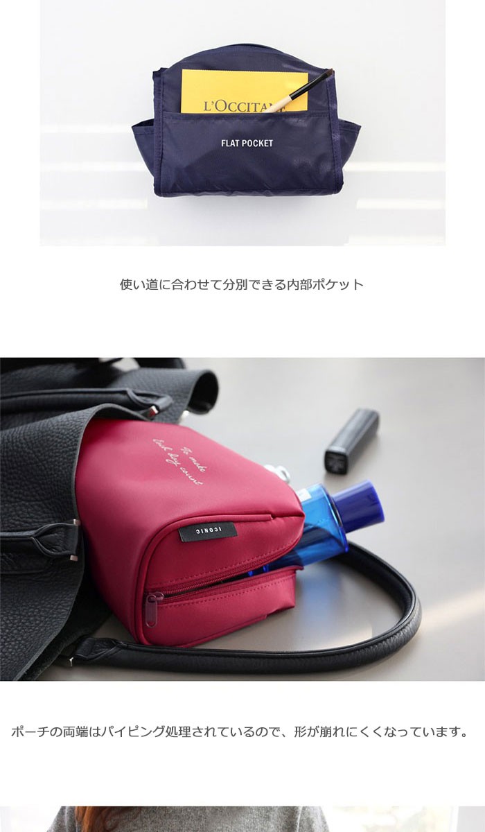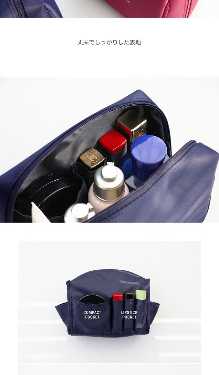 商品説明メイクアップ製品を効率的に収納・整理できるポーチです。内部ポケットがあるので、リップやファンデーションなど小分けできて便利です。