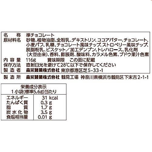 原材料:砂糖、植物油脂、全粉乳、デキストリン、ココアバター、チョコレート、小麦パフ、乳糖、チョコレート風味チップ、ストロベリー風味チップ、脱脂粉乳、ビスケット/加工デンプン、トレハロース、乳化剤(大豆由来)、香料、膨脹剤、酸味料、カラメル色素、ブドウ果汁色素