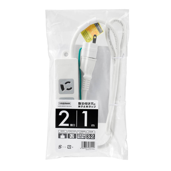 ●ヤザワ Y02EJNP201WH2PA 抜け止めタップ 3ピン式 2個口 1m 取り付け穴付 ホワイト
