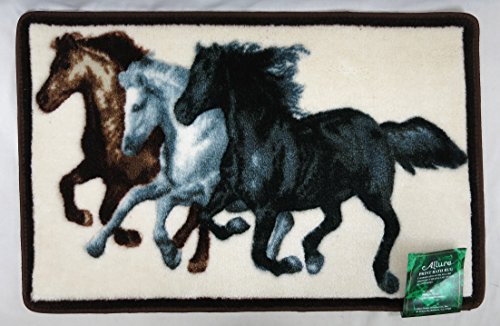 - White bath rug has three wild stallions galloping and a brown border