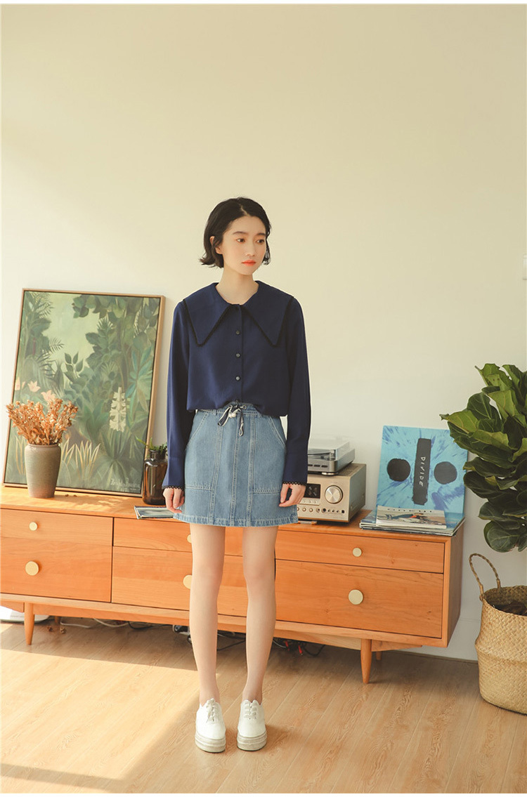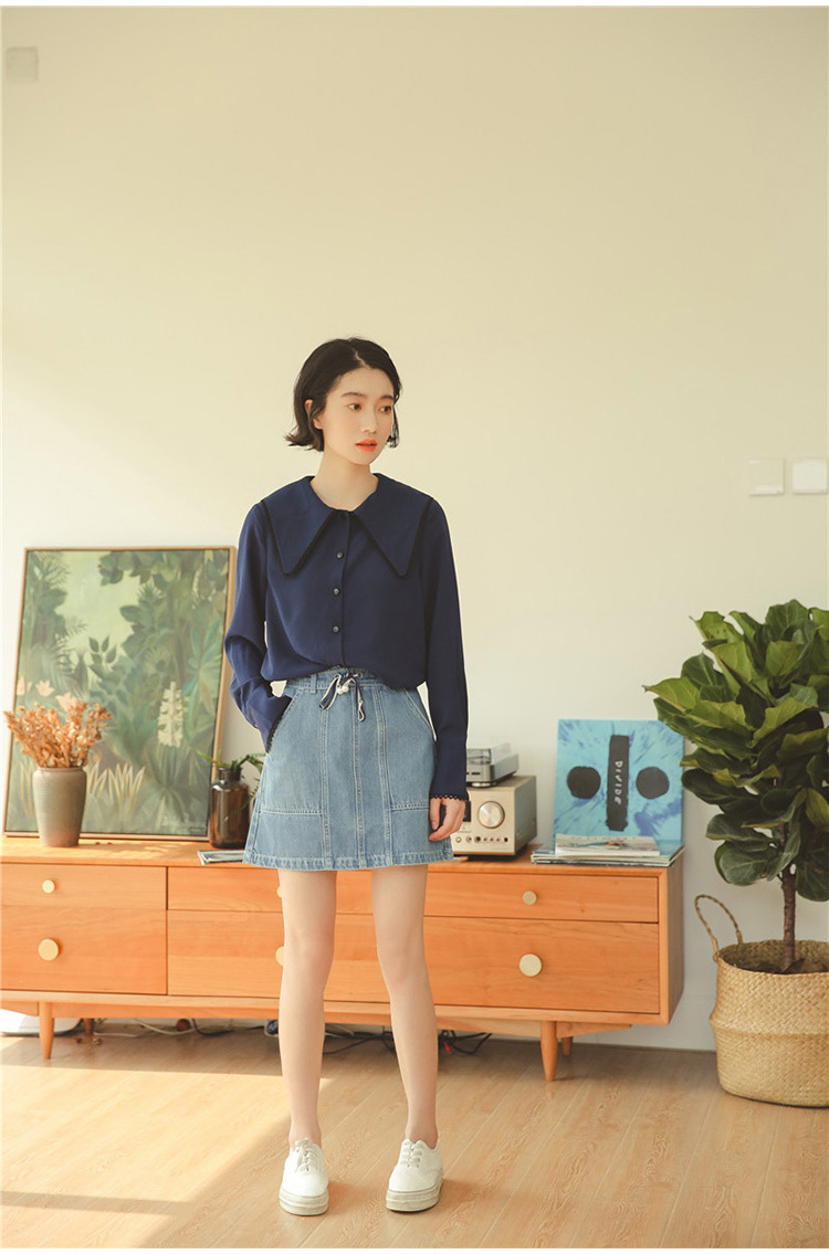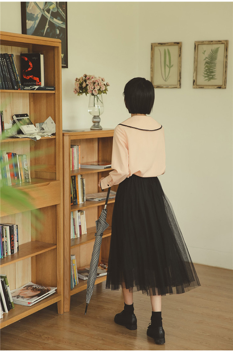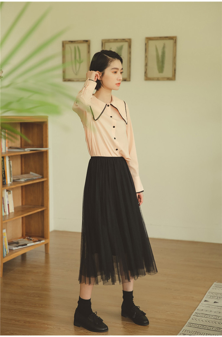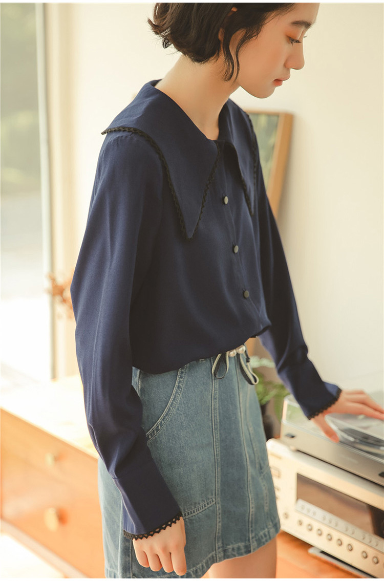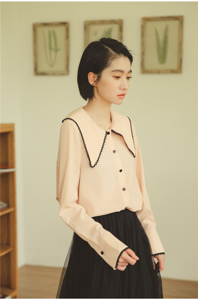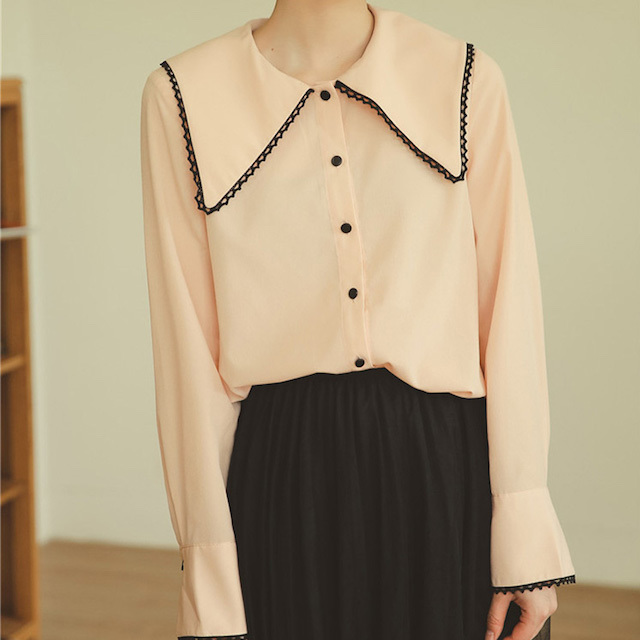 ふんわりとした素材が女性らしく、前後に広がる大きな襟が印象的な長袖シフォンシャツです。