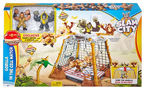 -. Binding : Toy -. Brand : Mattel -. Department : Toys -. EAN : 0746775341985 -. Feature : In the WWE animated series, Slam City, Superstar Randy Orton becomes a zoo keeper - and mayhem ensues! / This over-the-top steel cage playset doubles as a gorilla cage and the gorilla escaped! / Help Randy by using the palm tree launcher to shoot him towards the monkey targets atop of the cage / Cage has breakable walls and a bouncy ring surface-bounce your figures into mayhem! / Set comes with steel cage ring, palm tree launcher, Randy Orton Slam City figure and a gorilla figure -. IsAdultProduct : 0 -. Label : Mattel -. LegalDisclaimer : 30% restocking fee for unopened items. 50% restocking fee for opened items. -. Manufacturer : Mattel -. Model : BHL28 -. MPN : BHL28 -. NumberOfItems : 1 -. PackageQuantity : 1 -. PartNumber : BHL28 -. ProductGroup : Toy -. ProductTypeName : TOYS_AND_GAMES -. Publisher : Mattel -. Studio : Mattel -. Title : WWE Slam City Gorilla in a Cell Match Playset -. UPC : 746775341985 -. Warranty : No Warranty