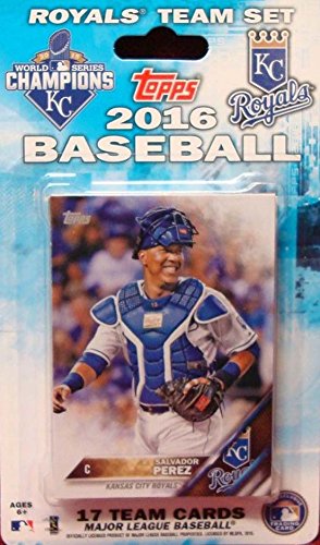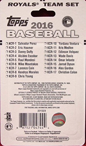 [Product Information]- This is a 2016 Topps Kansas City Royals Factory sealed special edition 17 card team set; cards are numbered KCR-1 through KCR-17 and are not available in packs. Players included are Salvador Perez, Eric Hosmer, Danny Duffy, Alcides Escobar, Raul Mondesi, Mike Moustakas, Lorenzo Cain, Kendrys Morales, Chris Young, Yordano Ventura, Kris Medlen, Edinson Volquez, Wade Davis, Omar Infante, Jarrod Dyson, Alex Gordon and Christian Colon.