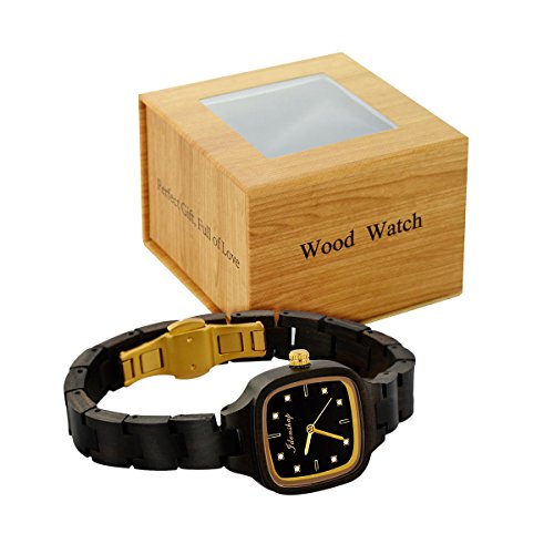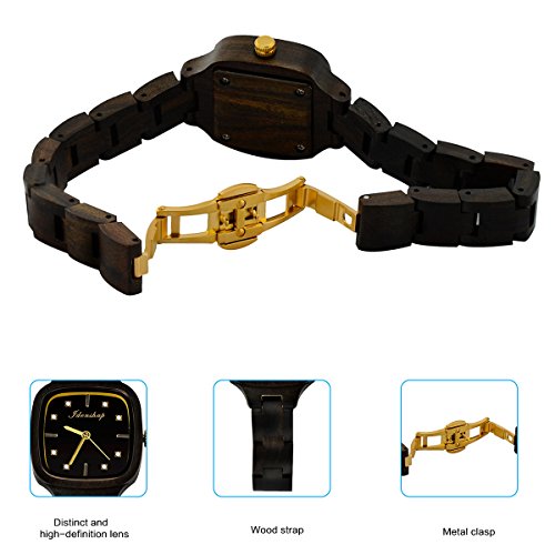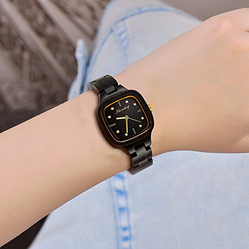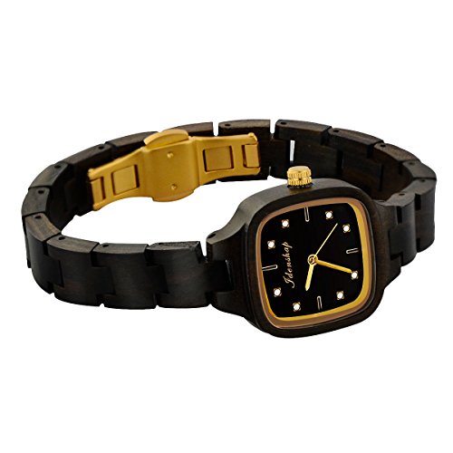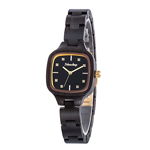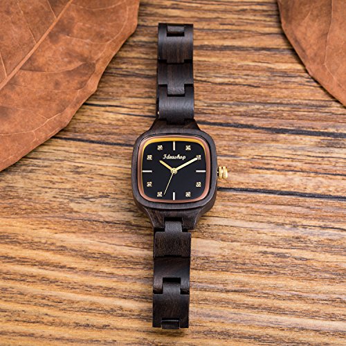 Ideashop Wooden Watch for Women with Crystals Swiss Movement Wristwatches Natural Wood Watch Black