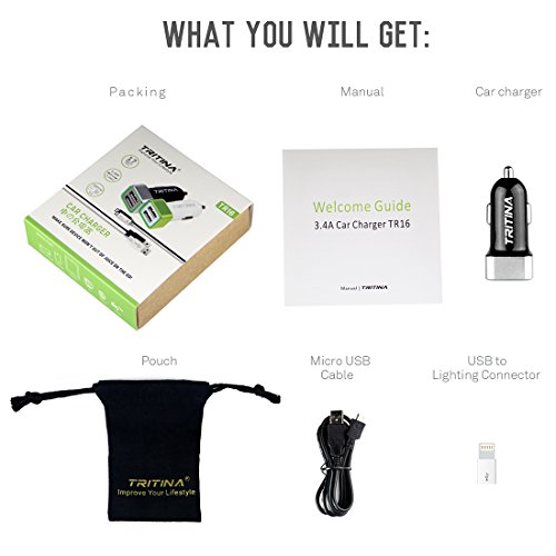 PACKAGE CONTENT - Universal Car Charger (Premium 17W 2-Port USB Car Charger), welcome guide, USB Cable, Lighting Connector and Quality Pouch.