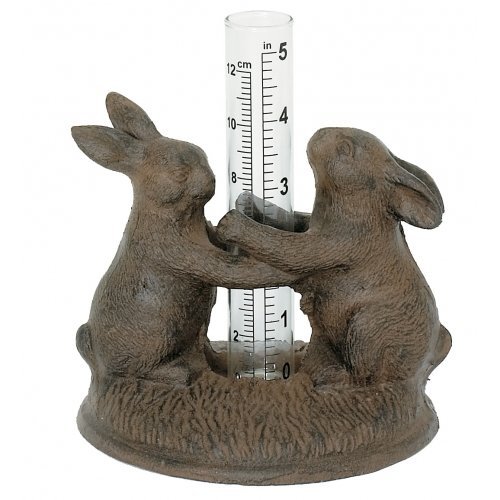- This sturdy cast iron rain gauge features two rabbits and a glass rain gauge which can collect up to 5 inches of water