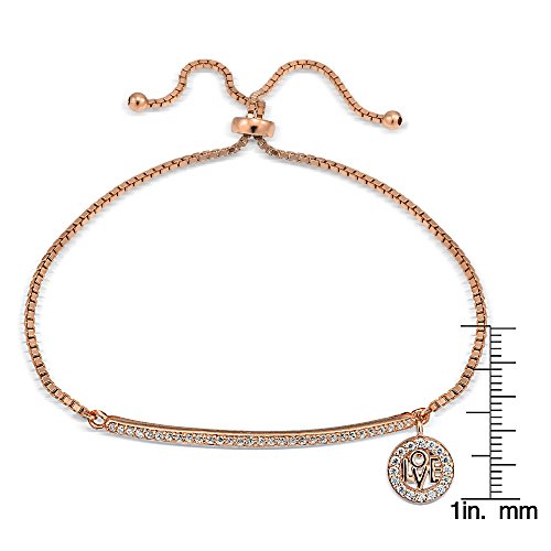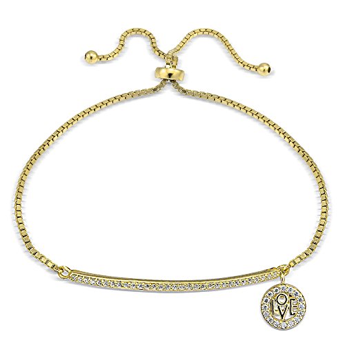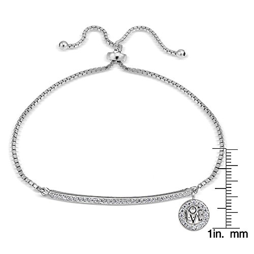 -. Binding : Jewelry -. Brand : Hoops & Loops -. Department : womens -. Feature : HOOPS & LOOPS PROVIDES HIGH QUALITY FINE JEWELRY: Hoops & Loops jewelry collection pieces are personally curated and inspected P.R.Ior to being sent out to customers to ensure perfection and complete satisfaction. / FREE SATIN POUCH WITH EACH PURCHASE: We send our jewelry with a free specially Hoops & Loops branded satin gift pouch. / UNIQUE ANTI-TARNISH COATING: All of the Hoop & Loop fine rings are coated with a special anti tarnish polish that will preserve their shine and beauty. / 100% SATISFACTION GUARANTEED: We guarantee all our customers 100% satisfaction from our products! All our jewelry comes with a lifetime guarantee! / ADJUSTBLE FIT & BOX CHAIN STYLE: These Hoops & Loops Bracelets feature a Box Chain. This bracelet is also adjustable so it will fit all wrist sizes and you can adjust it to your own comfort levels, from 3-10 Inches. -. Label : Hoops & Loops -. Manufacturer : Hoops & Loops -. ProductGroup : Jewelry -. ProductTypeName : FASHIONNECKLACEBRACELETANKLET -. Publisher : Hoops & Loops -. Studio : Hoops & Loops -. Title : Hoops & Loops Sterling Silver Cubic Zirconia Love Charm Bar Adjustable Pullstring Bracelet