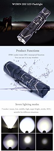 - Seven lighting modes ( moon, low, middle, high, super bright, strobe, SOS ) are suitable for different occasions;Pcd circuit board is imported from Japan, stable performance, to ensure that the flashlight 7-8 years of life