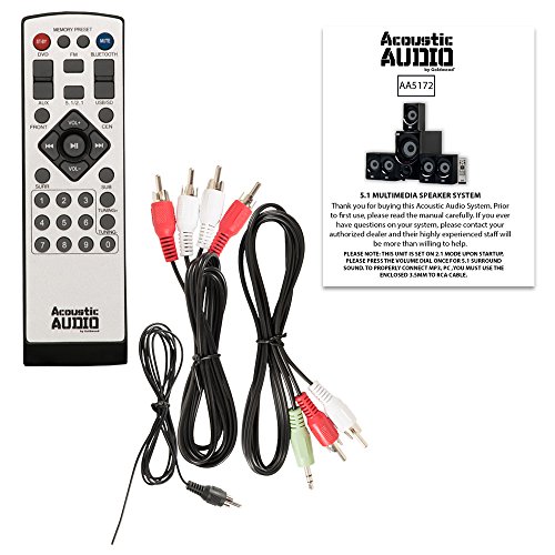 -. Feature : Acoustic Audio AA5172 powered 5.1 Bluetooth home theater speaker system with FM tuner, 700 watts system power, frequency response: 20hz-20 kHz, magnetically shielded satellite speakers / Integrated Bluetooth receiver and audio amplifier, subwoofer speaker (H x W x D): 13.1" x 6.7" x 12.3", 5 full range 2 way satellite speakers (H x W x D): 6.7" x 4.1" x 4" each / Front panel controls, USB/SD card reader, 5 discrete independent channel inputs and outputs, 2 fronts and 1 center satellite speakers have a 6' single RCA cable, 2 rear speakers have 12' single RCA cables / Enhanced bass boost design, illuminated display, bass, treble and main volume controls, stereo auxiliary input, pro surround function, computerized enclosure design / Use for home entertainment system, laptop or PC, DVD player, gaming, MP3 player, cell phone, tablet or any other device with a 3.5mm headphone output or RCA audio output