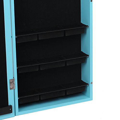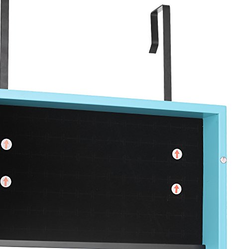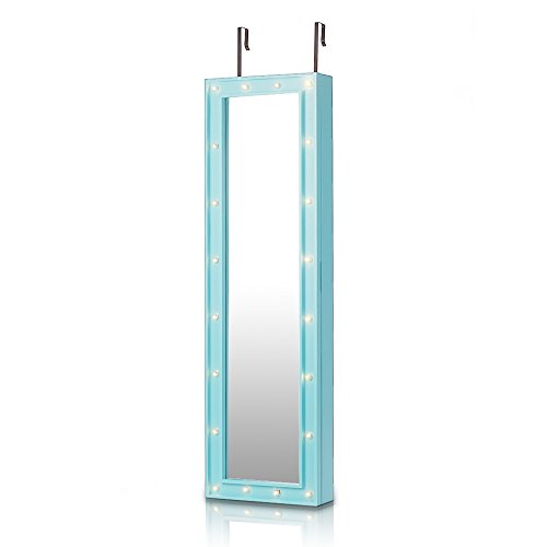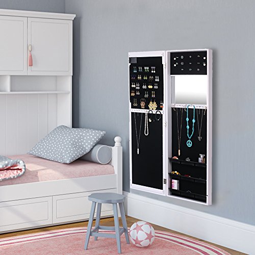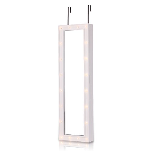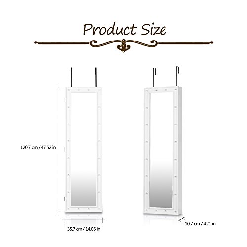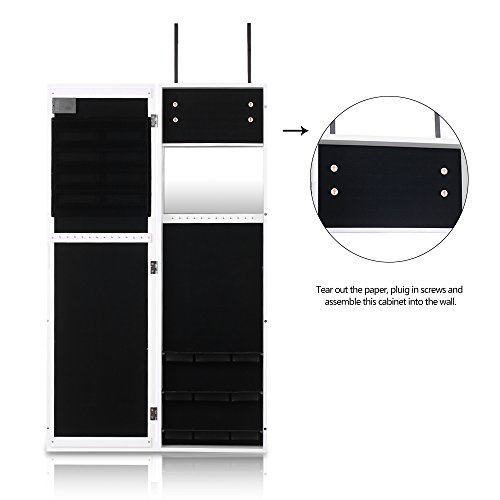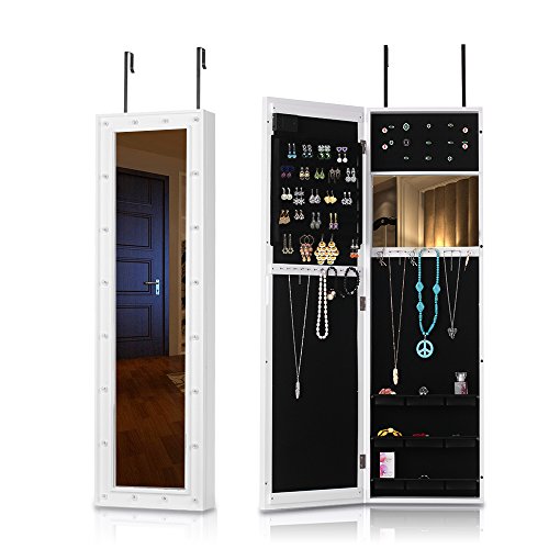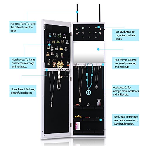 -. Feature : Excellent material and craft, sturdy and durable. / Real Glass Mirror: Equipped with 2 mirror both outside and inside, for jewelry wearing, making up, cloth choose. / Outside LED Lights: 20 LED lights in the door, you can use it at dark place. / Wall & Door Mounted: Can be hung over the door, or mounted on the wall with screws, both way are space-saving. / Professional Storage Dividen: 5 tier notches for earrings, 24 hooks for long/short necklaces, 3 layer grids for watch, cosmetics, top square area for ear studs.