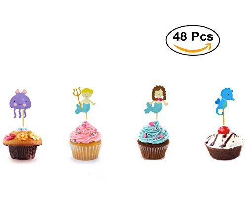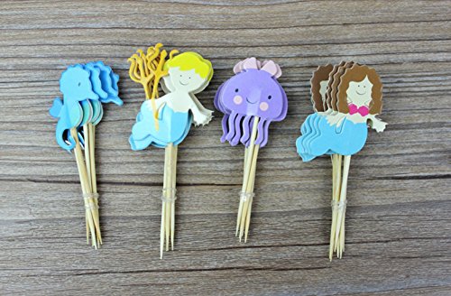 Maydolbone 48 Pcs Mermaid Hippocampus Mizuki Kids Party Decoration Paper Cupcake Toppers, Fruit Picks for Decoration - for jungle themed birthday or baby shower Food Picks Decor And Cupcake Party Pick