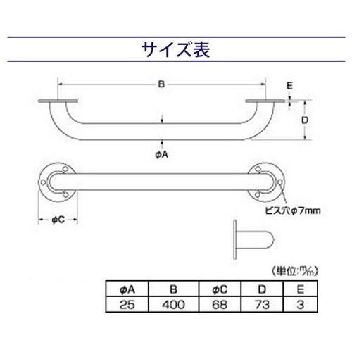 fk094igrjs錆びにくいステンレス(SUS304)を使用した手摺。 滑り止めテープ付です。 製造国:中国 素材・材質:ステンレス(SUS304) 商品サイズ:直径25×400mm 重量:約410g 付属品:滑り止めテープ取り付けネジ※お届け地域により、別途運賃がかかる場合やお届けできない場合がございますので、お問い合わせ下さい。