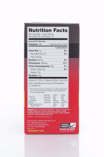 100 Calories per 1 gel pack, 12 servings per container, Calories from Fat 9, Total Fat 1 g, 2%, Saturated Fat 1 g, 5%, Trans Fat 0 g, Sodium 60 mg, 3%, Potassium 400 mg, 11%, Total Carbohydrate 22 g, 7%, Dietary Fiber 2 g 8%, Sugars 17 g, Protein 0.5 g, Vitamin C 70%, Calcium 25%, Iron 4%, not a significant source of Cholesterol or Vitamin A. Dates, filtered water, EnergySource (grape juice, natural rice dextrins), sorghum malt, electrolyte blend (calcium, vitamin C, chloride, phosphorous, magnesium, sodium, potassium, zinc, copper, selenium, chromium), coconut oil, citric acid, natural raspberry and strawberry flavors.