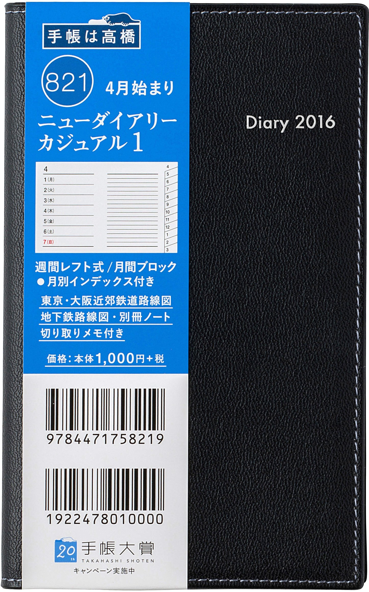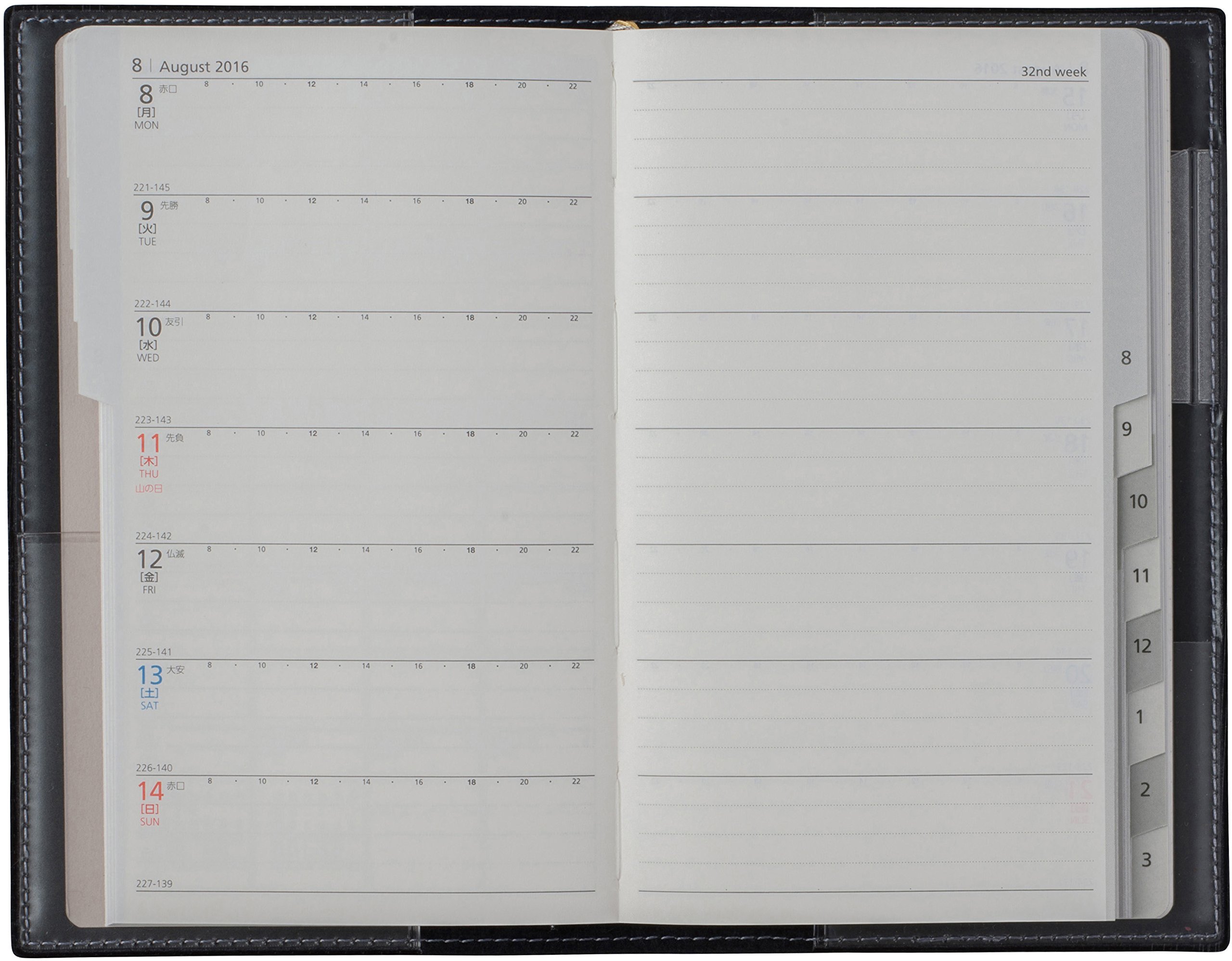 The left page is a schedule section for one week, the right page is free sideways keimemo.