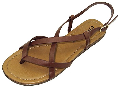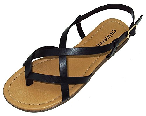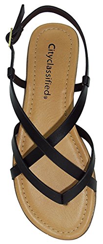 Product Description This flat sandal from City Classified Footwear features cross over strap detailing, adjustable buckle closure, thong toe, and low, flat heel. Imported. 0
