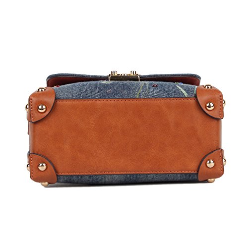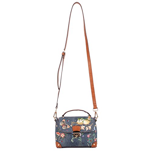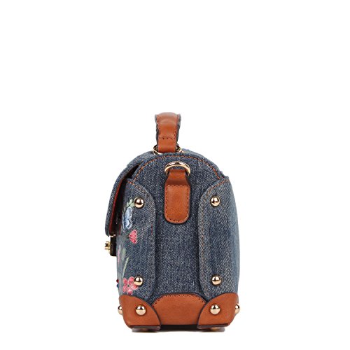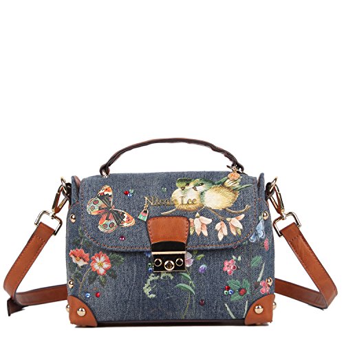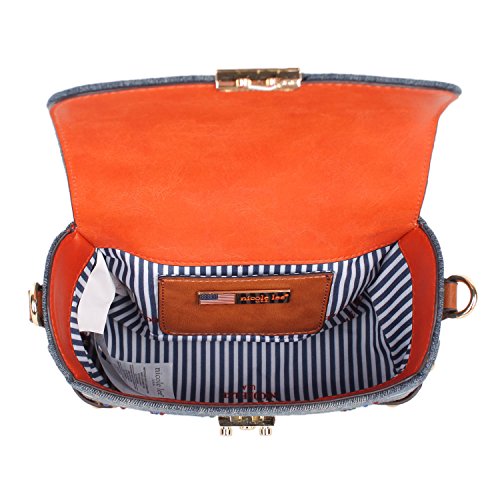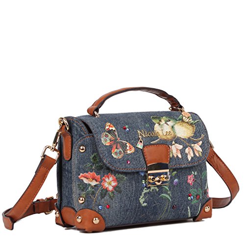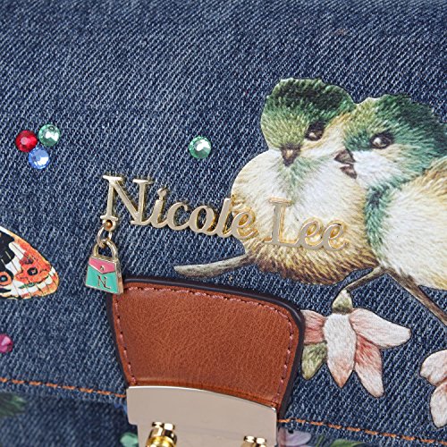 Product Description A busy day awaits, take style with you carrying this Nicole Lee Cassia Denim Flower Saddle Bag. Exterior Features: Made of denim with hotpress floral design and rhinestone embellishments. Font flap top with push lock closure. Vegan leather top handle with NL authentic medallion. Detachable shoulder strap. Vegan leather reinforced corners. Structured silhouette. Protective metal foot base. NL gold-tone signature at front. Interior Features: Open compartment, wall pocket at back with NL nameplate and NL stripe logo nylon lining. Vegan leather handles with 3" inch drop. Includes adjustable and detachable 44" - 53" inch shoulder strap. Colors available are Denim Flower. For cleaning, wipe with damp cloth. 0