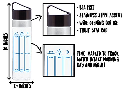 Size & Features - 20 oz (600 ml.) 100% BPA-free reusable water bottle is made of a safe and durable, scratch-resistant Tritan material. Hand-wash recommended. The bottle comes with an easy-open screw cap and wide mouth so you can add ice cubes. The 20oz. size is convenient and compact, yet big enough to keep you hydrated. To get your recommended daily water intake just fill the bottle three times a day and follow the recommended time markings.