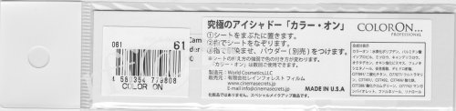 -. Feature : 究極のアイシャドウ「カラーオン」ならプロの様なアイメイクがたった30秒!! / カッコイイ!? 可愛い!? セクシー!? きっと毎日違うあなたに出会える。 / 「究極のアイシャドウ」「時短メイク」として注目度が急上昇中のインスタントアイシャドー「カラーオン」(読売TV「あさパラ!」、朝日TV「おはよう朝日です」など各局TV番組で紹介されました) / 使い方はとっても簡単! 「カラーオン」のシートをまぶたをやさしくおおって上から指でそっと馴染ませるだけ。あっという間にお好みのカラーが転写できちゃうお手軽なアイシャドウです。 / 商品内容:カラーオンシート 1枚(色が薄くなるまで何度もご使用できます)
