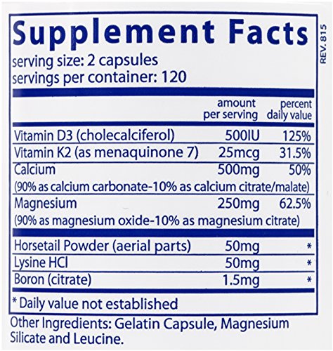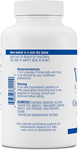 Osteo-Nutrients II is a comprehensive bone support formula which contains high amounts of elemental Calcium and Magnesium, as well as the other essential nutrients for healthy teeth and bones. Calcium is essential to many physiological functions such as helping to maintain and build bone mass and strength before and during menopause. Boron, which also plays a role in bone health, has been added to this formula. Vitamin K2-7, menaquinone, promotes the ability of osteocalcin to bind calcium and supports healthy bone mineralization. Besides supporting bone health, Vitamin K2-7 also promotes healthy cardiac and vascular function. Regular exercise and a healthy diet with enough Calcium helps teen and young adult women maintain good bone health. Adequate Calcium intake is important, but daily intakes above 2000mg are not likely to provide additional benefit. Vital Nutrients mission is to manufacture superior quality nutraceuticals that exceed both industry and government standards and provide clinically effective results. They provide over 200 science-based and clinically effective products. They have a comprehensive quality assurance program to ensure that purity and potency is consistently met on every product that they manufacture. Vital Nutrients uses independent U.S. ethical laboratories to test all raw materials and finished products. Each raw material is tested, regardless of origin, for purity and potency. All finished products are tested through a real time stability protocol for expiration date validation. They are an FDA Inspected facility that exceeds FDA cGMPs, and a member of the NPA.Feature