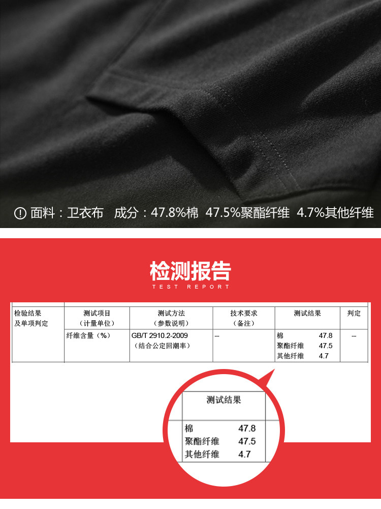 | 面 料:47.8%棉 47.5%聚酯纤维 4.7%其他纤维 帽里: 棉 罗纹:97.9%棉 2.1%氨纶颜 色:黑色 |