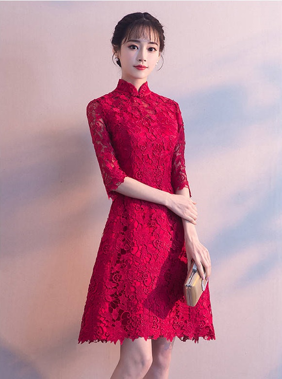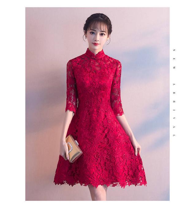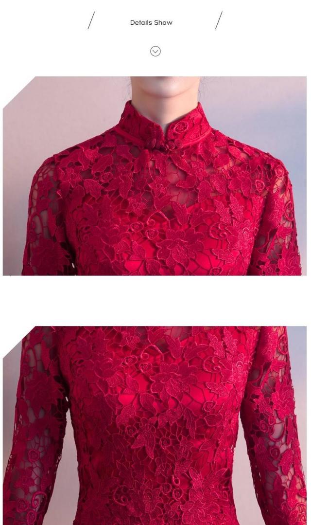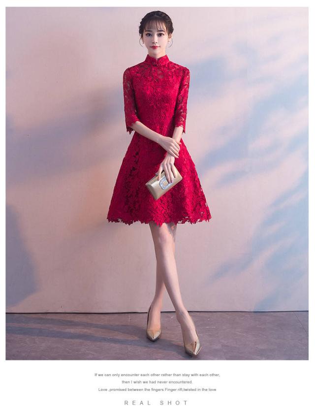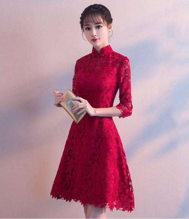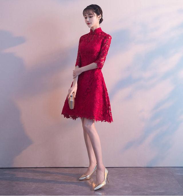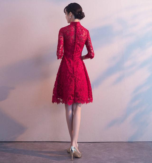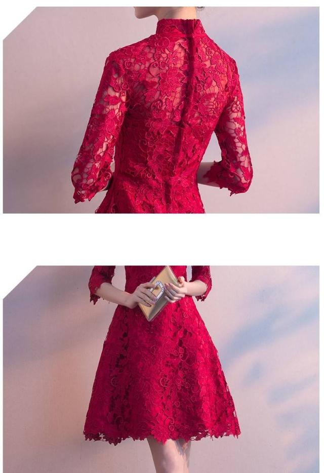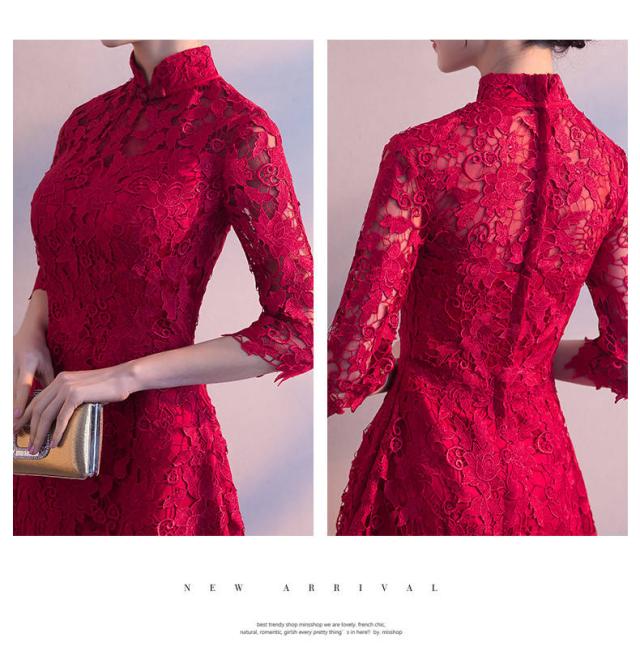 パーティードレス 結婚式 ワインレッド 七分袖 スタンドカラー 二次会 謝恩会 披露宴 卒業パーティー 成人式