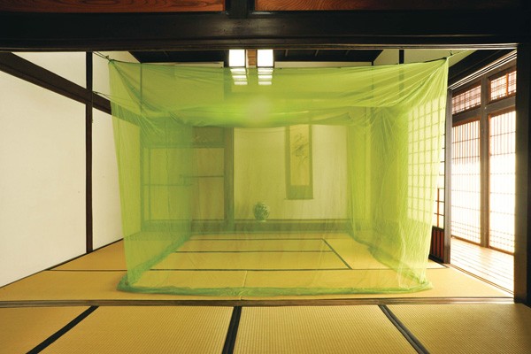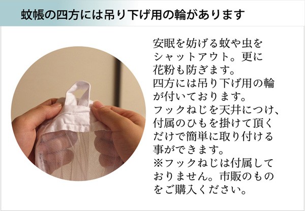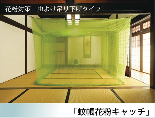 花粉キャッチ機能付きの吊り下げタイプ蚊帳です。メーカーが独自に開発した粘着力のある液体と水を掛け合わせ、熱処理をして網部分に加工しました。花粉症で眠れない方の睡眠をサポートします。通常の蚊帳と同じく、蚊やハエなどからも守ってくれます。またクーラーの風が直接当たりませんので快適にお休み頂けます。天井にフックねじを付け付属のひもを掛けて頂くだけで簡単に取り付け出来ます。またコンパクトに畳めますので収納にも困りません。※フックネジ等は付いていません。市販のものをご購入下さい。
