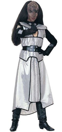 -. Binding : Apparel -. Brand : Rubie's -. ClothingSize : Approx size 12 for 38"-40" chest & 29"-32" waist -. Color : Gray -. Department : mens -. Feature : 100% Polyester Silver Dress With Wide Black Belt And Long Black Sleeves With Klingon Insignia Appliques / Dress is padded to give that klingon look / Also includes a klingon skull cap headpiece with long, flowing black hair and that all-important forehead / Hand wash in cold water, dry flat / Officially Licensed Star Trek Costume Is Made In China -. Genre : TV/Movie Characters -. IsAdultProduct : 0 -. Label : Rubies Costumes - Apparel -. Manufacturer : Rubies Costumes - Apparel -. Model : 889069STD -. MPN : 889069R -. NumberOfItems : 1 -. PackageQuantity : 1 -. PartNumber : 889069R -. ProductGroup : Apparel -. ProductTypeName : ADULT_COSTUME -. Publisher : Rubies Costumes - Apparel -. Size : Approx size 12 for 38"-40" chest & 29"-32" waist -. Studio : Rubies Costumes - Apparel -. Title : Star Trek the Next Generation Secret Wishes Deluxe Klingon Costume