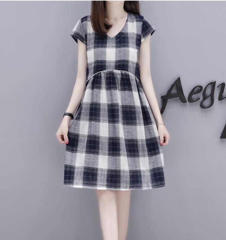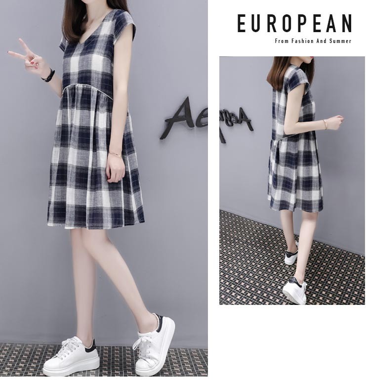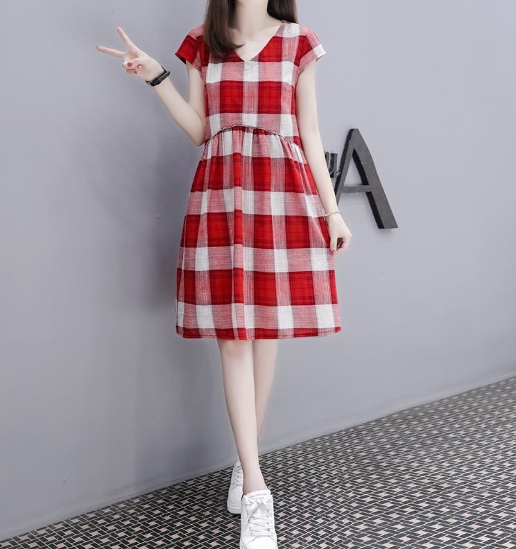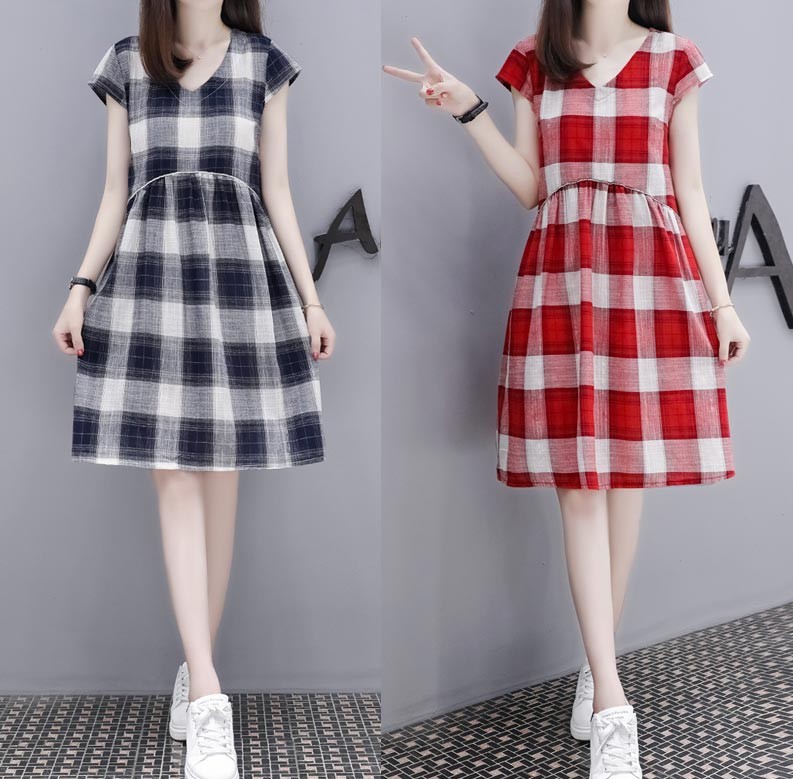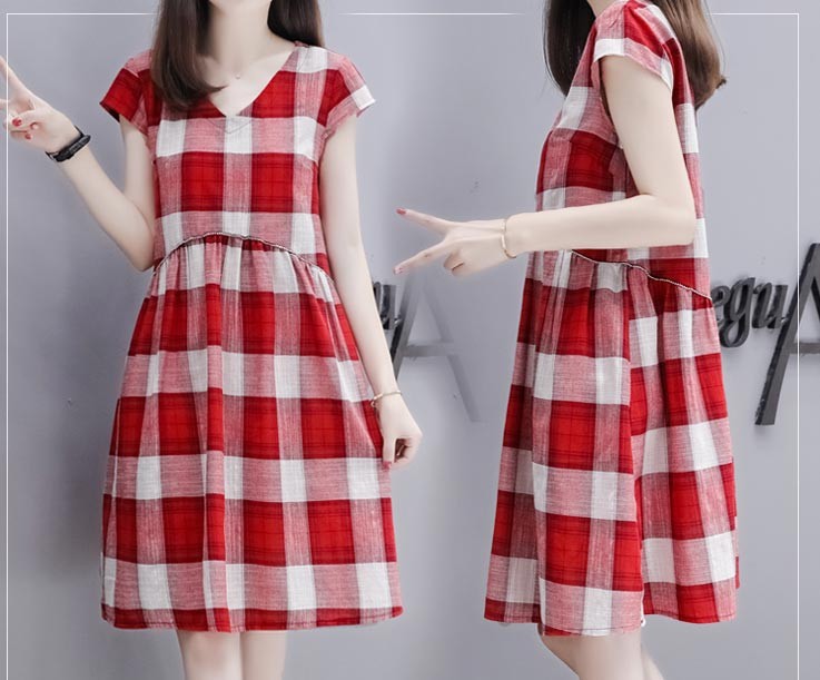 Vネック・半袖・ひざ上丈・大きなチェック柄のキュートなワンピース♪