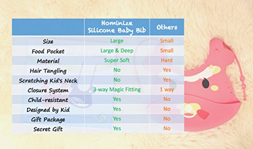 -. Binding : Baby Product -. Brand : Hominize -. Department : baby-girls -. Feature : ✓ MOST GENTLE SILICONE BIB - No more scratching to babies' neck! First-of-its-kind Strong INTELLIGENT CHILD RESISTANT CLOSURE SYSTEM®. Can be worn as an easy to put on shoulder backpack/ secured criss-cross back/ big circle around the neck. No more worries of kids pulling off! No more tangling to your kid's hair! No more hinders to littles hands movement! Multiple adjustment levels for fast growing kid! / ✓ UNIQUE OVER SHOULDER WEAR - With 360° HUGE FOOD POCKET®. Highly Customizable and Personalized for a snug fit. Provides ample coverage and a full protection from shoulders to chest for very active babies/infants. The innovative flexible pouch design catches more crumbs, particles and spill whenever your littles move around. Suitable for both high chair and dining table at home or restaurants! / ✓ ROLL OVER N GO - Compact, quick drying and ready to use. Anti-microbial material prevents the development of germs or mold as of regular use. Stain resistant and odorless. Dishwasher safe. Simply rinse off or wipe clean. Safe to be used as a food plate, snack bin or teething toy. Now having fun and healthy meals is just as easy as it should be. "My niece absolutely loves her bib!" (Amazon Customers) / ✓ DESIGNED BY KIDS FOR KIDS - Super cute and funny Cartoon Sheep/Whale Drawings by Kids! Available in vibrant Pink or Periwinkle colors for baby boys/girls to toddlers (6 months - 3 years). The Most Comfortable Bib loved by very sensitive babies. Less Mess, More Confidence Self Feeding during meal time. Comes in a nice box for Baby Shower Gifts! A must-have for the exciting second year, especially for busy mothers or frequent travelers! / ✓ ANYTIME, ANYWHERE - Made of 100% FDA Food-grade Ultra Soft Silicone. BPA free & Naphthalene free. Suitable for Eating, Drinking, Medicine taking and Baby-led weaning. "Efficient bib and food particle catcher!" (Amazon Customers) -. IsAdultProduct : 0 -. Label : Hominize -. Manufacturer : Hominize -. PackageQuantity : 1 -. ProductGroup : Baby Product -. ProductTypeName : BABY_PRODUCT -. Publisher : Hominize -. Studio : Hominize -. Title : Ultra Soft Silicone Bib with Smart Food Catcher ♥ Waterproof and Easily Wipes Clean ♥ Comfy 3-Way Fitting Suitable for Toddlers/Infants of All Ages ♥ FREE Gift Baby Led Weaning Ebook