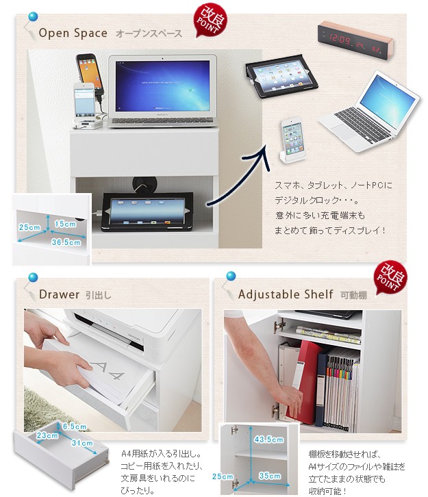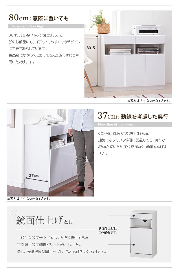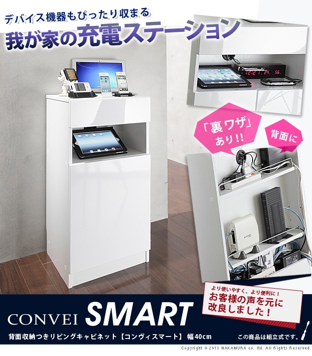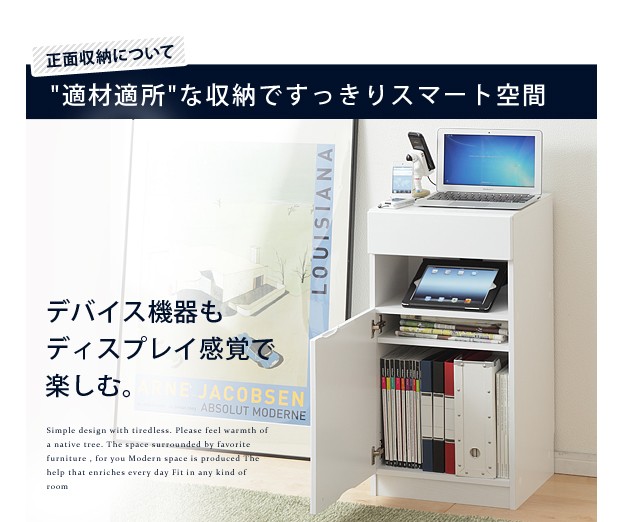 商品について:デバイス機器がぴったり収まるフラットでスタイリッシュなデザインのマルチキャビネット。オープンスペースにはコードキャップが付いているので、スマホやタブレット、ノートPCなどの充電スペースに最適☆背面収納機能付きですので、ゴチャゴチャしがちな充電器のコード類、ルーターやモデム・コンセントタップなども見えない場所にスッキリまとめられます。扉の中は可動棚1枚付き。棚板を移動させればA4サイズのファイルも立てたまま収納OK。前面はほどよい光沢の鏡面仕上げ。美しい光沢を長期間保ち、汚れも付きにくくなっています。