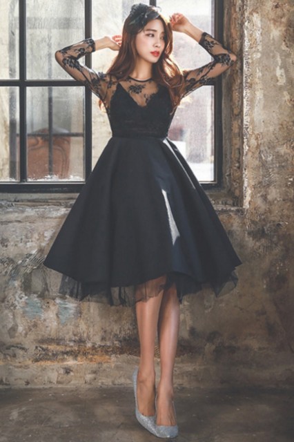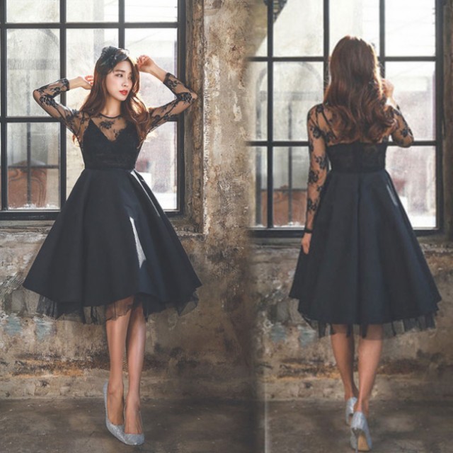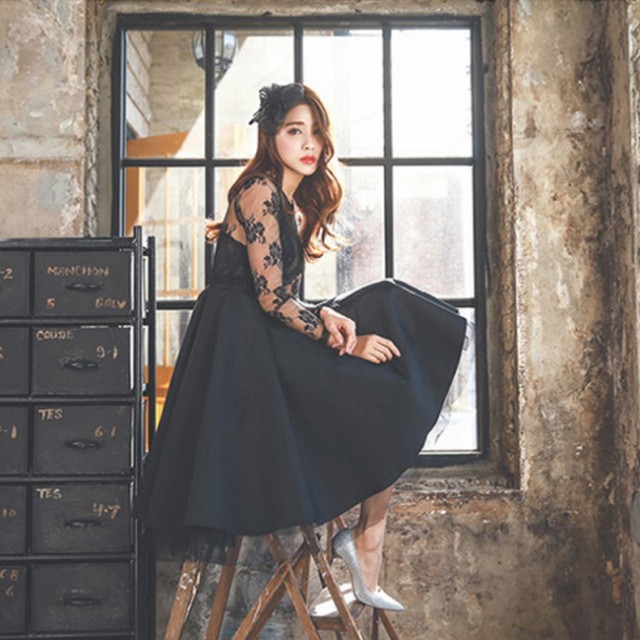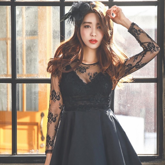 花柄刺繍のシースルーロングスリーブで大人の魅力がたっぷりなAラインドレスになっています。
