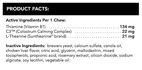 Composure Chews contain three active ingredients. The C3 Colostrum Calming Complex is isolated from proteins that have a calming effect on animals. These colostrum proteins are bioactive and meant to work synergistically with the L-theanine included to support cognitive functions and stress reduction.
