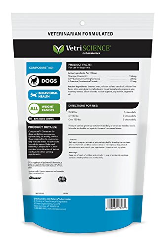 When humans are exposed to new environmental stressors like a new job or the in-laws visits, we can relax with a warm bath, a cup of tea, or a soothing song. When cats and dogs are exposed to similar stressors (like a car ride or a new baby), their options for relaxation are fewer. Anxiety can run high in dogs who are unwittingly placed in different environmental situations, causing actions like incessant scratching, barking, urine marking or aggressive behavior. Composure Chews are formulated to address these habits and the anxiety that leads to their proliferation.